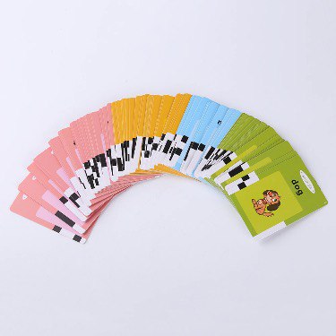 This product comes with 112 double sided flashcards making a total of 224 words of animals, foods, people, and transportation.