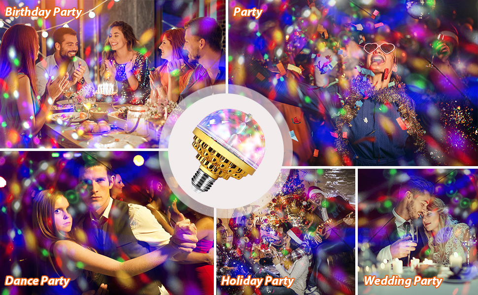 This light is a rotating bulb, which provide red, blue and green, and can automatically change and rotate. It has the stroboscopic effect of a disco dance, and is an excellent choice for an active party. Whether you're hosting a holiday gathering, looking to brigthen up your home for the season or simply setting up Christmas tree, Halloween, New Year, bridal shower, wedding and so on