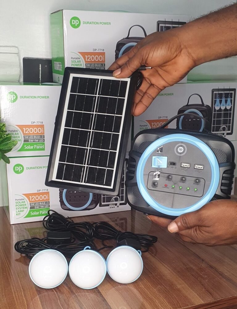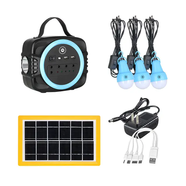 Package Includes (1 power box, 1 power adapter, 1solar panel charger, 3 Led bulbs, 1 multi – USB cable)
