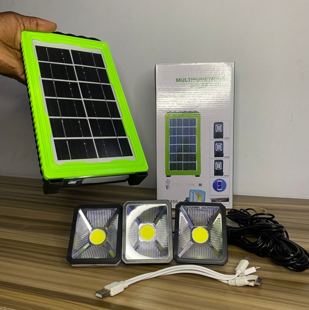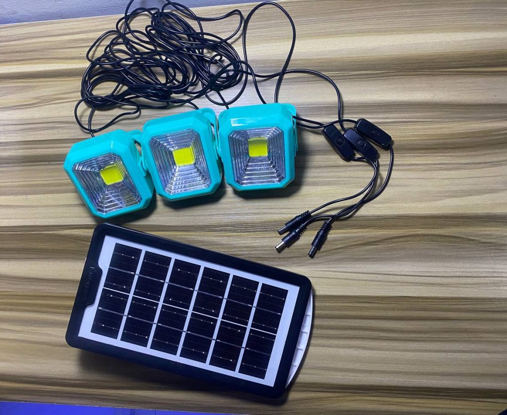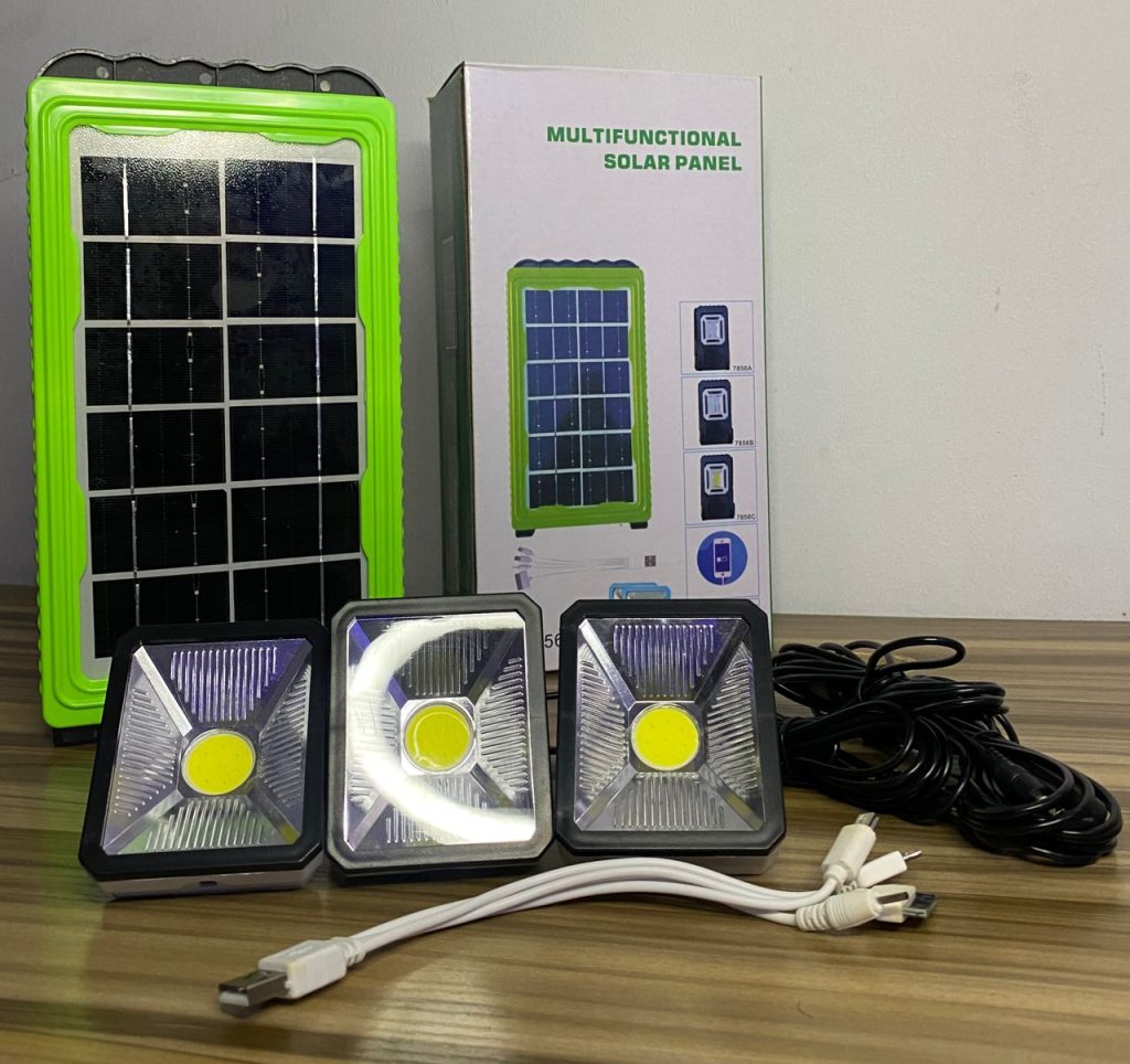 Package Includes (1 power box, 1 power adapter, 1solar panel charger, 3 Led bulbs, 1 multi – USB cable)