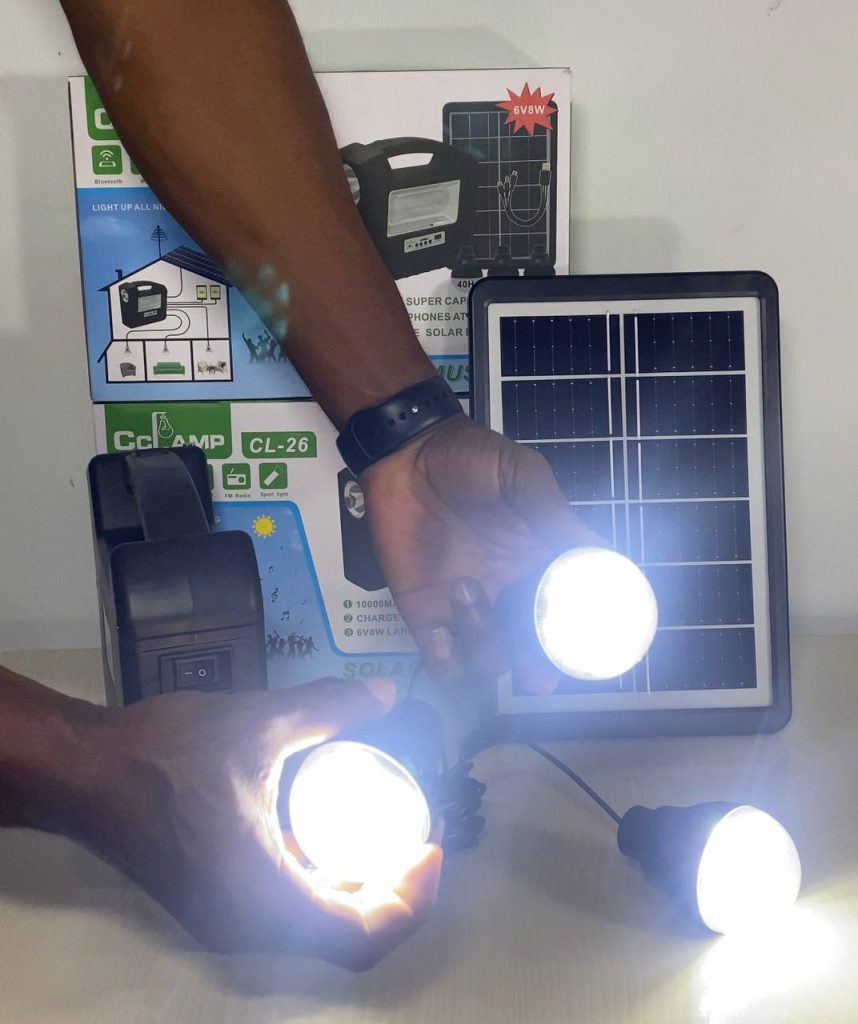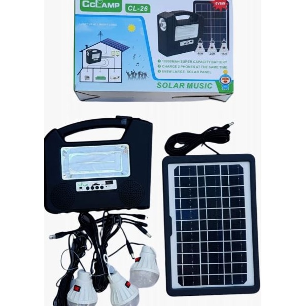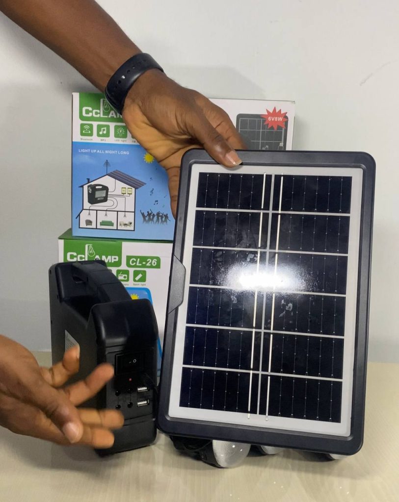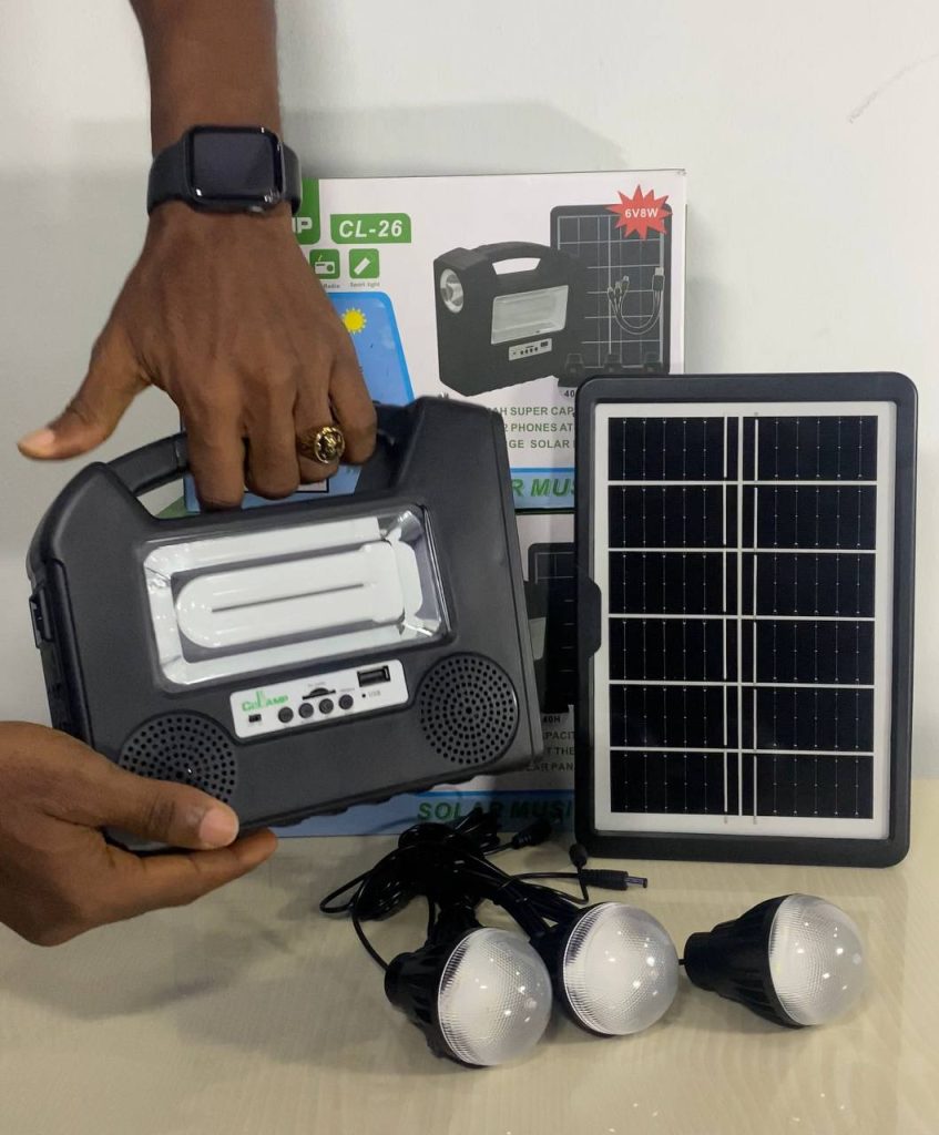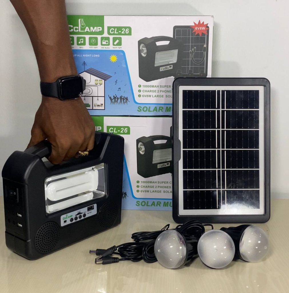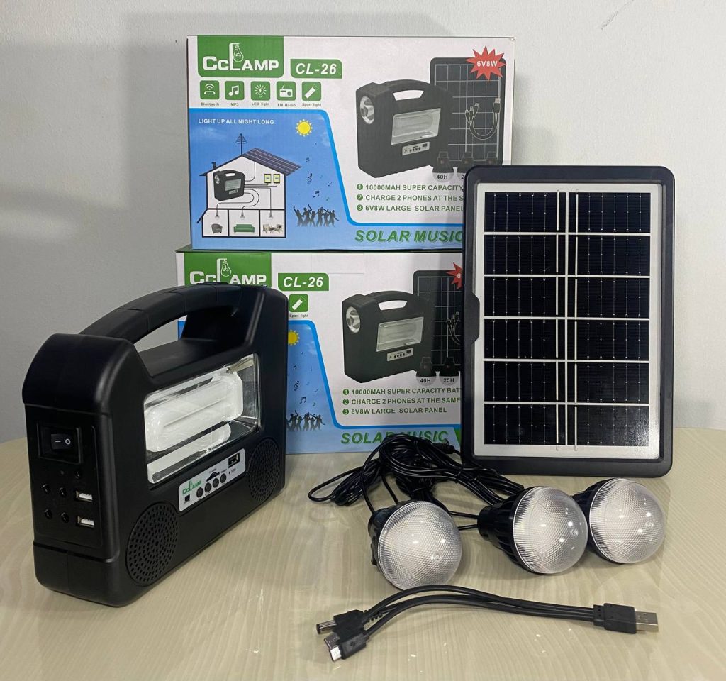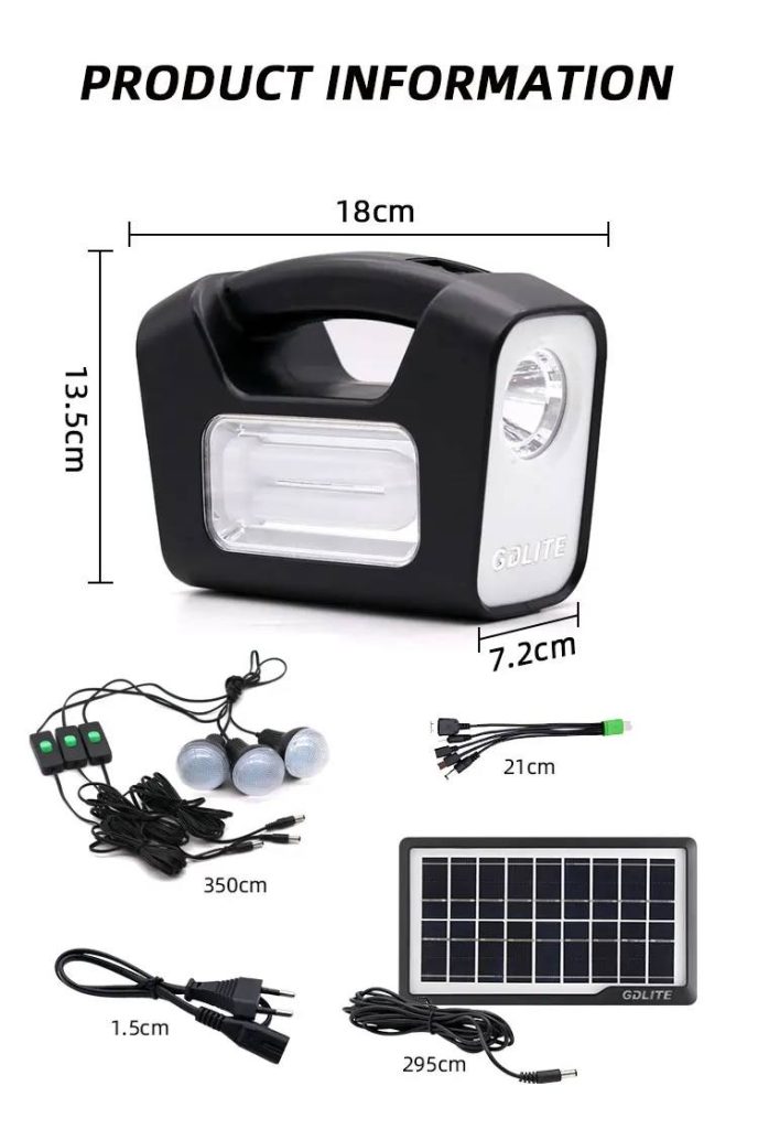 Package Includes (1 power box, 1 power adapter, 1solar panel charger, 3 Led bulbs, 1 multi – USB cable 1 FREE FAN)