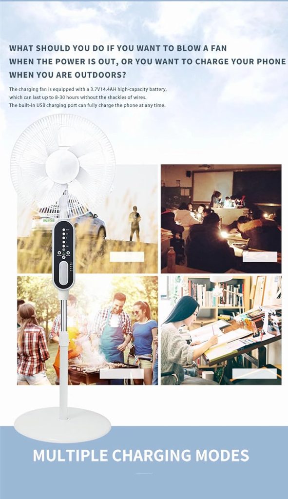 A durable, affordable, and multipurpose solar-powered rechargeable fan with AC/DC functionality. It boasts long battery life, can charge phones, and comes with light bulbs to brighten your surroundings