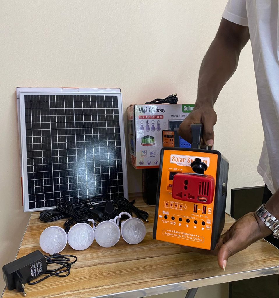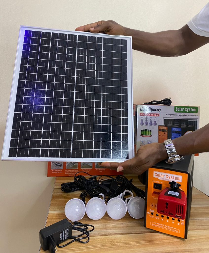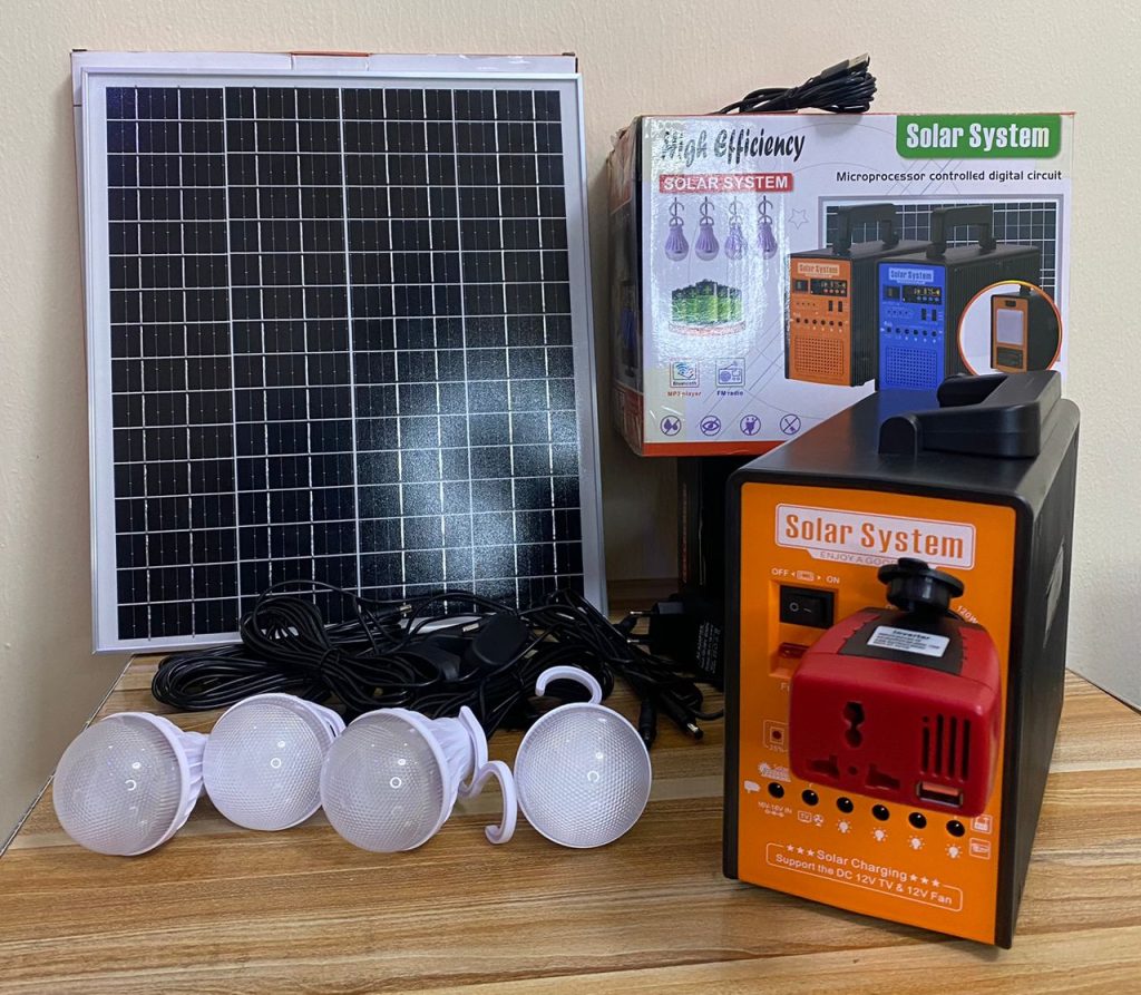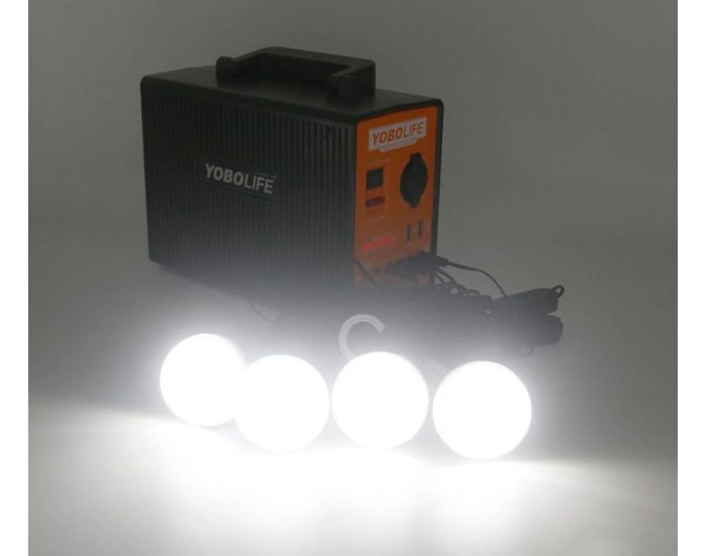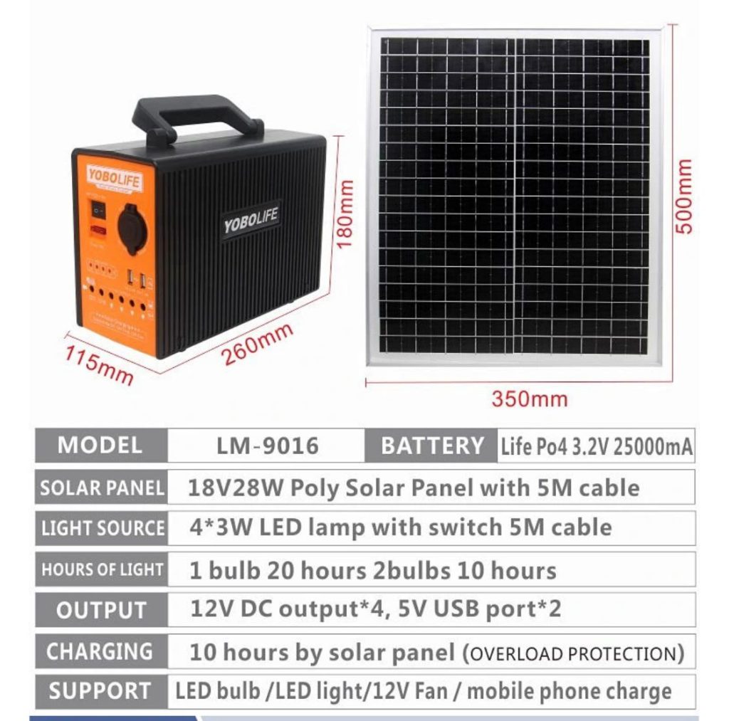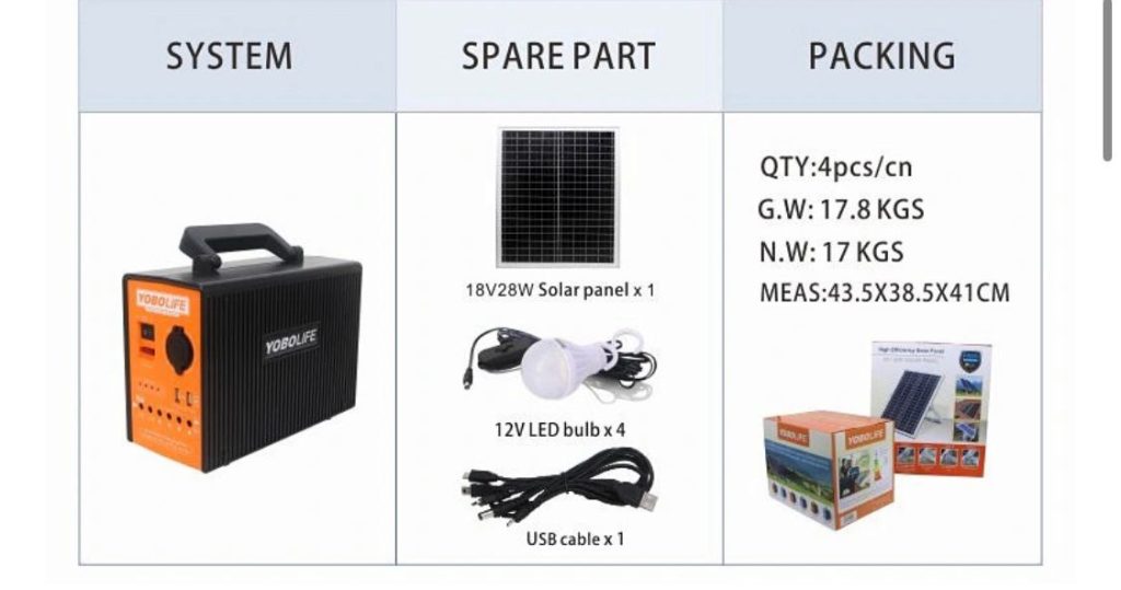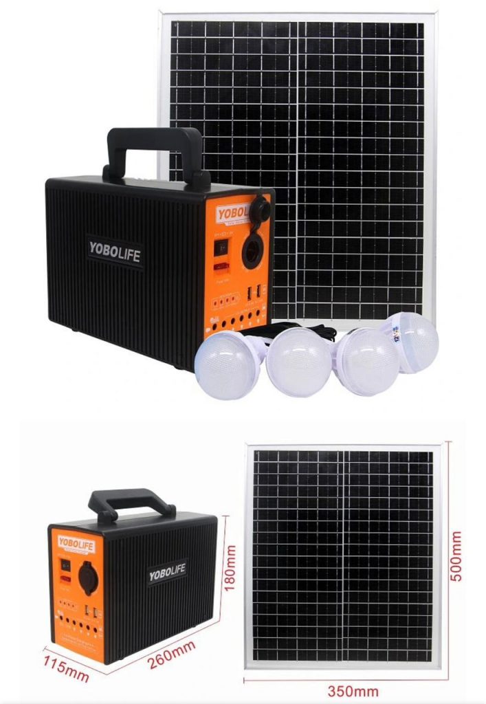 Package Includes (1 power box, 1 power adapter, 1solar panel charger,4 Led bulbs, 1 multi – USB cable)